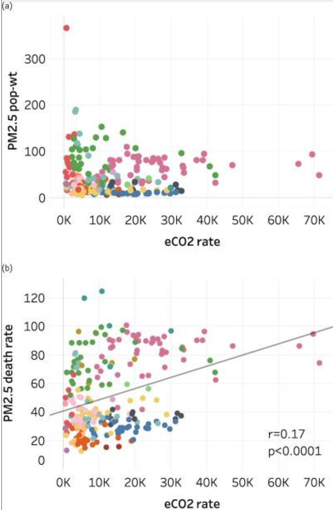 (a) Population-weighted annual average PM2.5 concentration (µg/m3) vs. annual CO2 emissions rate (t C per 100,000 people);