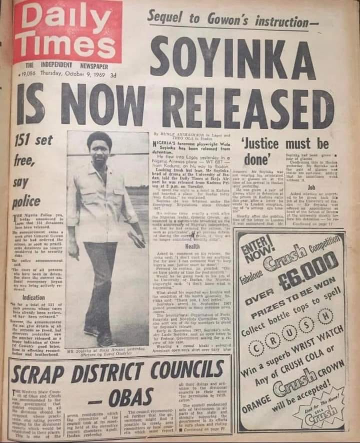 Again, this is the headline of the Daily Times on Thursday, October 9, 1969, the day after Wole Soyinka was released from 22 months of imprisonment for advocating for Biafrans. Fifty-five years later, the children of those he fought for are insulting him and saying things like, ‘You no go die better’, ‘Your father!’ and ‘Stomach Infrastructure’.